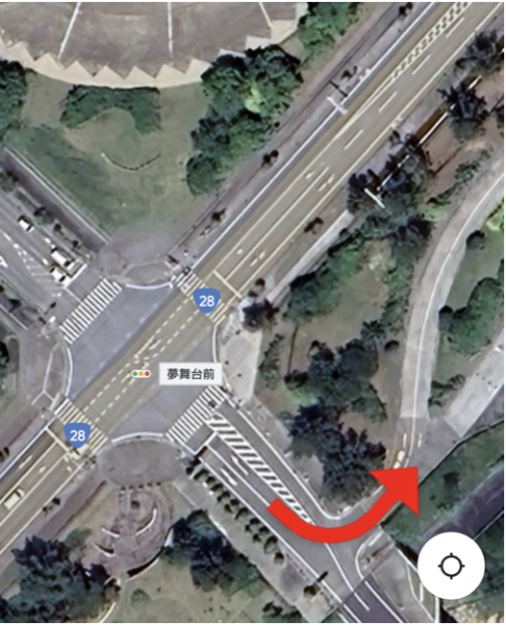 夢舞台という交差点を東方向へ曲がり、すぐの入り口を左折、その後直進をし川を渡ってすぐを左に進みます。基本的に画像の通りに進んでください。